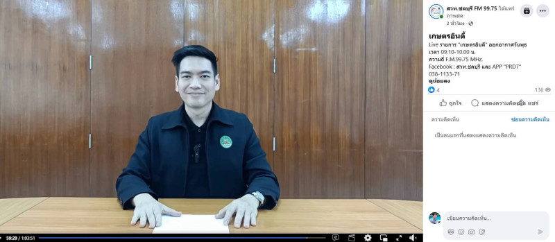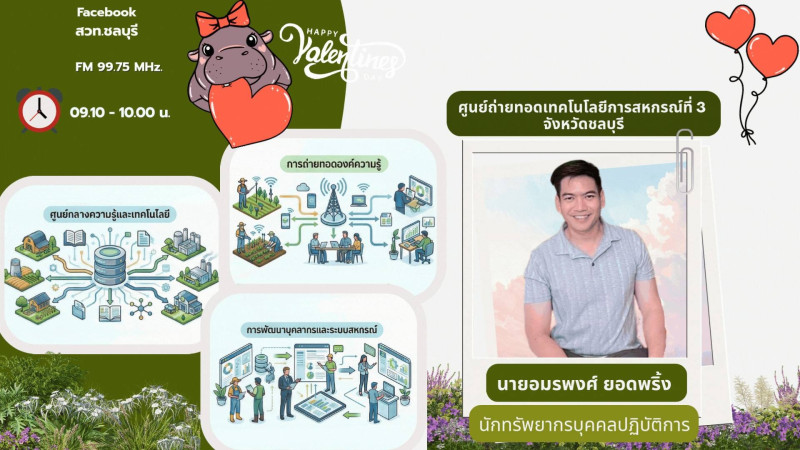 วันที่ 11 กุมภาพันธ์ 2569 นางสาววิภารัตน์ โมริดา ผู้อำนวยการศูนย์ถ่ายทอดเทคโนโลยีการสหกรณ์ที่ 3 จังหวัดชลบุรี มอบหมายให้ นายอมรพงศ์ ยอดพริ้ง นักทรัพยากรบุคคลปฏิบัติการ ดำเนินการจัดรายการวิทยุ “เกษตรอินดี้” ทางสถานีวิทยุกระจายเสียงแห่งประเทศไทยจังหวัดชลบุรี คลื่นความถี่ FM 99.75 Mhz. และถ่ายทอดสดผ่าน Page Facebook ของ สวท.ชลบุรี ทุกวันพุธ เวลา 09.10 – 10.00 น. (รวม 50 นาที) โดยนายอมรพงศ์ ยอดพริ้ง ได้นำเสนอข่าวประชาสัมพันธ์เกี่ยวกับการจัดงานเทศกาลโคนมแห่งชาติ การจัดกิจกรรมจิตอาสาพระราชทาน “เราทำความดี ด้วยหัวใจ” การแก้ปัญหามะพร้าวน้ำหอมราคาตกต่ำ การปล่อยคาราวานกระจายหอมแดงจังหวัดศรีสะเกษ การจัดงานสัปดาห์วันสหกรณ์แห่งชาติ ข่าวรับสมัครสอบแข่งขันเพื่อบรรจุเข้ารับราชการ การประชาสัมพันธ์ข้อมูลเกี่ยวกับศูนย์ถ่ายทอดเทคโนโลยีการสหกรณ์ที่ 3 จังหวัดชลบุรี รวมถึงข่าวเกี่ยวกับกรมส่งเสริมสหกรณ์เรื่องอื่น ๆ ที่น่าสนใจ